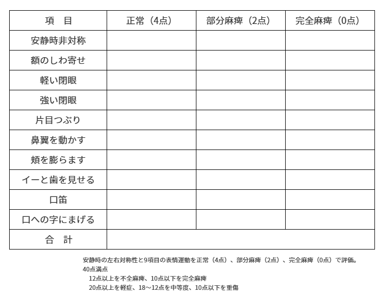 まず現状を把握し、重症度や予後予測をする柳原法と、重症度や後遺症評価をするSunnybrook法を採用しております。